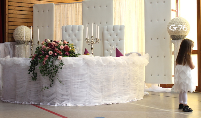 Kami memasuki ruangan, tamu sudah pada duduk rapi di jajaran kursi bermeja panjang. Dari tiga ratusan orang hanya 4 orang Jerman (2 orang lansia, suami saya dan dua anak saya-yang separo Jerman saja). Panggung tampak memerah dengan gordin yang dipasang. Sementara bawahnya ada kain putih. Di sebelah kanan, adalah singgasana mempelai perempuan. Kalau di pernikahan kami dahulu, kiri kanan adalah untuk kedua orang tua, waktu itu, justru untuk pendamping pengantin (bukan untuk orang tua). Seperti pernikahan barat yang butuh pembawa cincin? Entahlah, mau tanya-tanya telinga tak bisa dengar lantaran musiknya seperti dangdutan kencang sekali bunyinya.