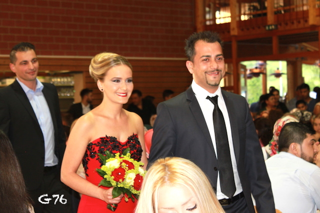 Dua jam setengah kemudian, kedua mempelai hadir di ruangan, menuju pelaminan. Tamu-tamu bertepuk tangan. Gaun merah berhias bordir indah sekali. Buatan asli Turki. Selain memang lebih percaya, katanya memang lebih murah menjahitkannya. Pas di badan, karena biasa ukuran di Jerman besar-besaaaaar.